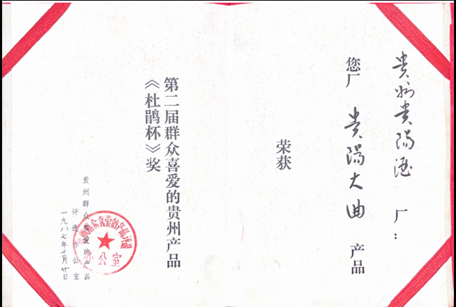贵阳大曲——1987年第二届群众喜爱的贵州产品《杜鹃杯》奖证书